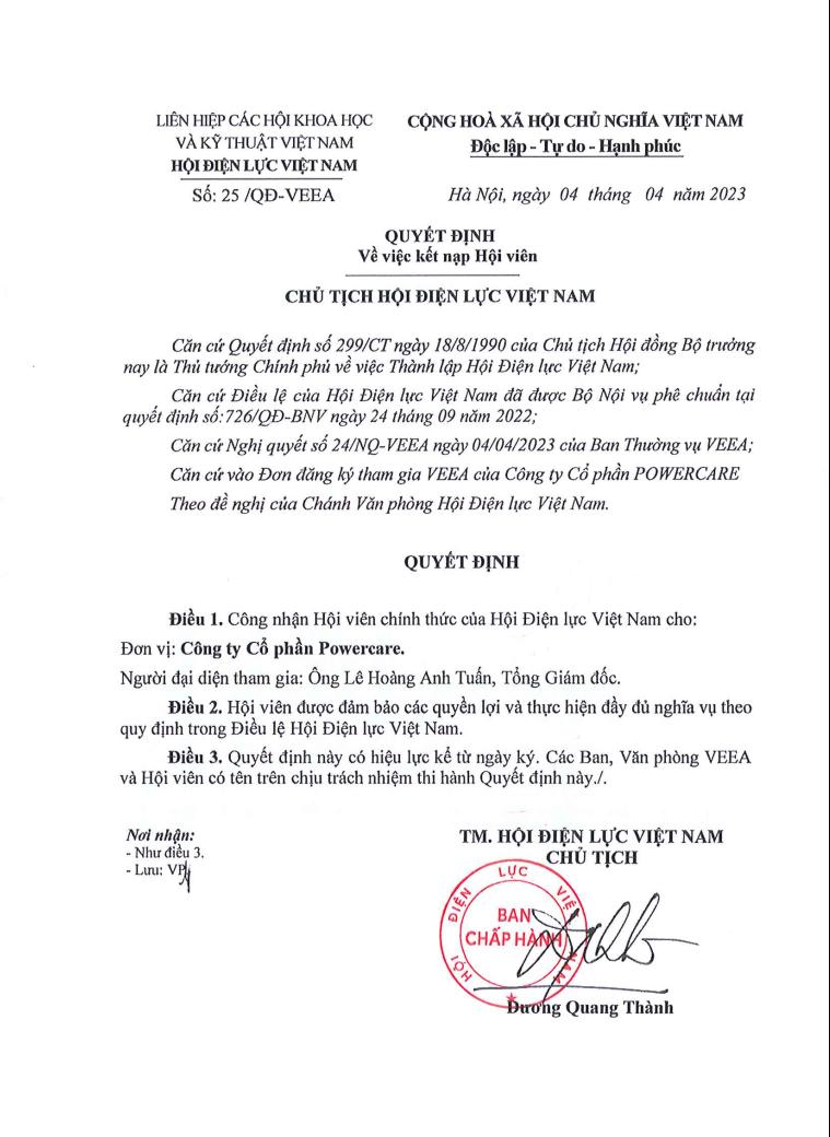 Powercare Joint Stock Company became an official member of the Vietnam Electrical Engineering Association (VEEA)